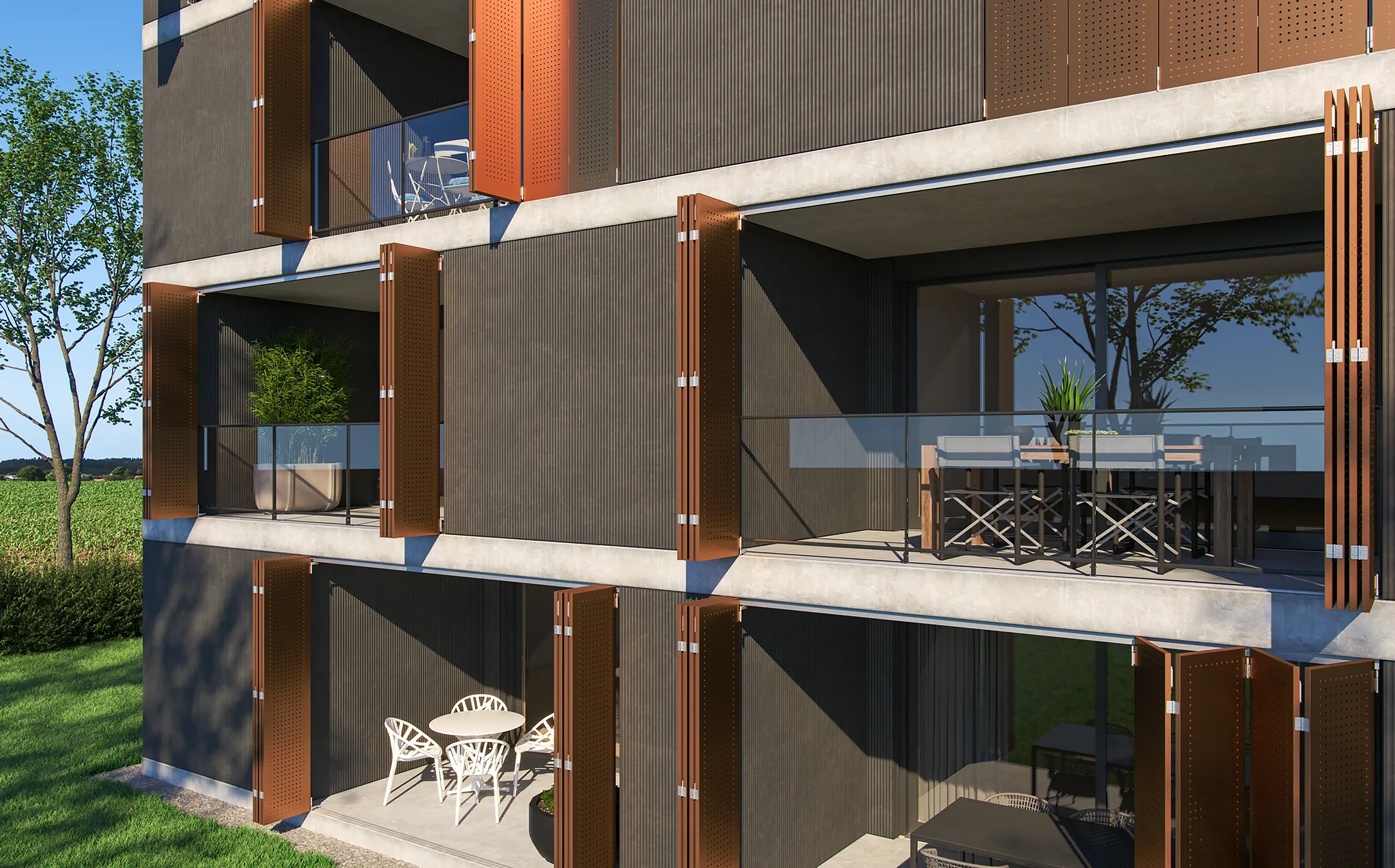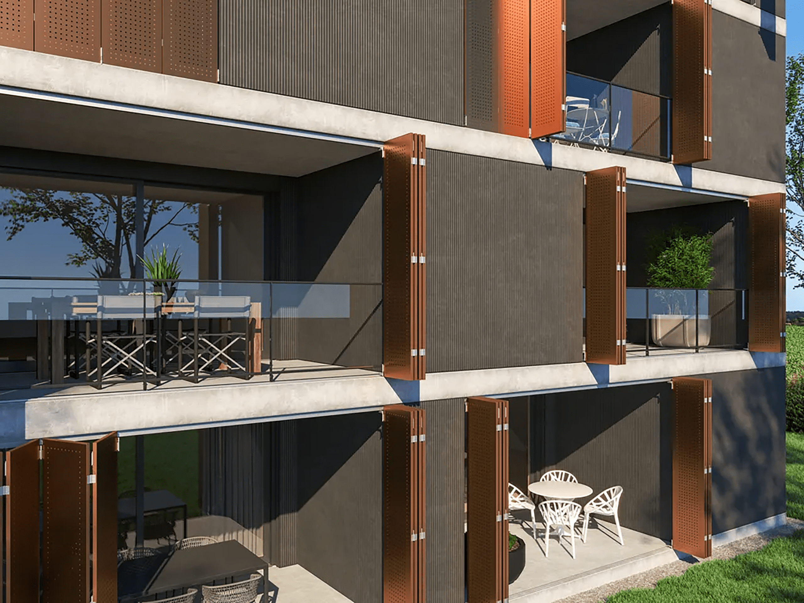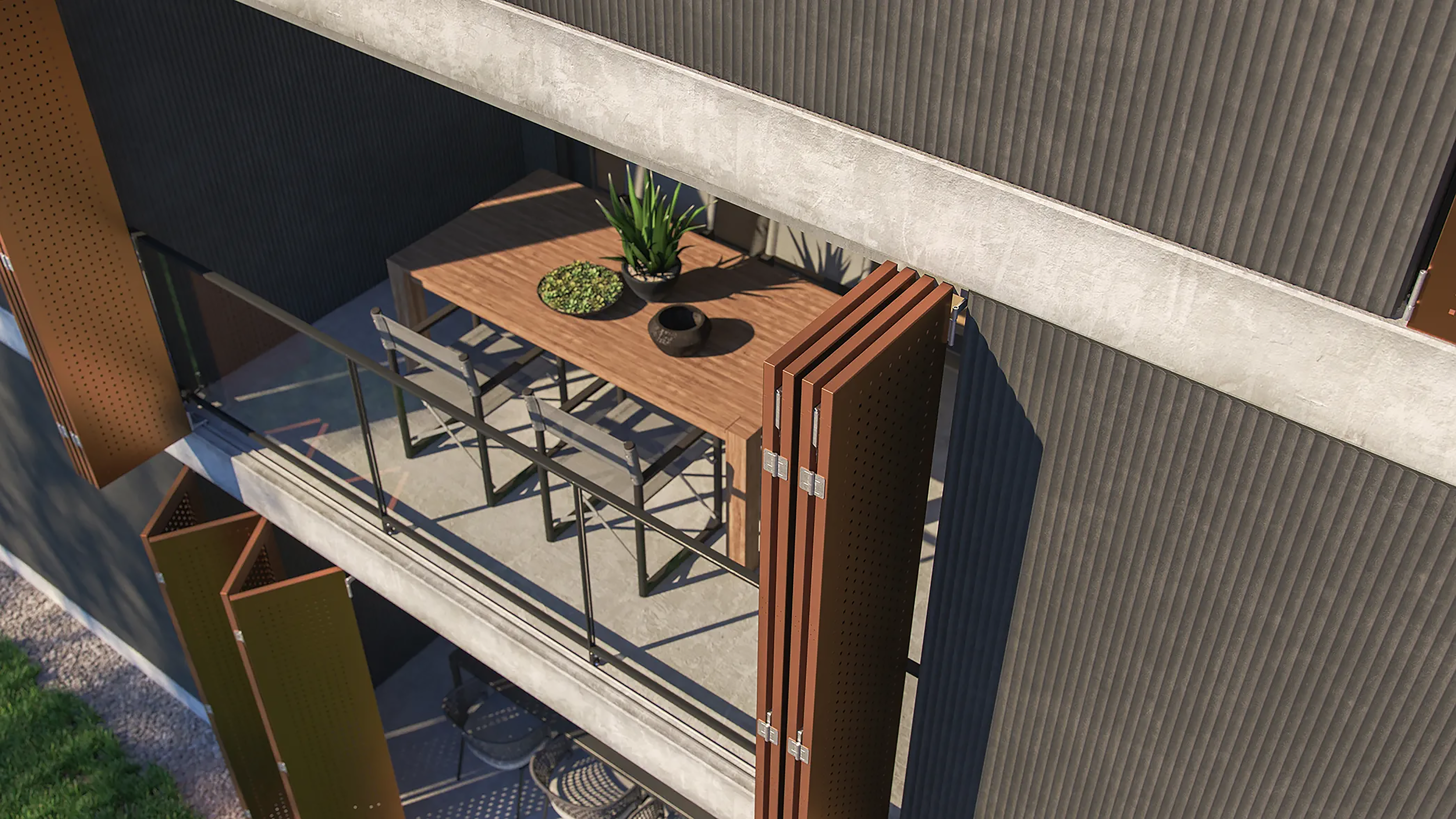 AVGFLEX FOLDING MANUAL harmonikové panely, skladacie fasádne krídla a harmonikové okenice, môžu byť navrhnuté tak, aby sa dali integrovať do kovovej predsadenej fasády AVG METAL. Vďaka tomu je možné dosiahnuť jednotný architektonický výraz naprieč celou budovou – od pevných fasádnych prvkov až po pohyblivé tienenie.