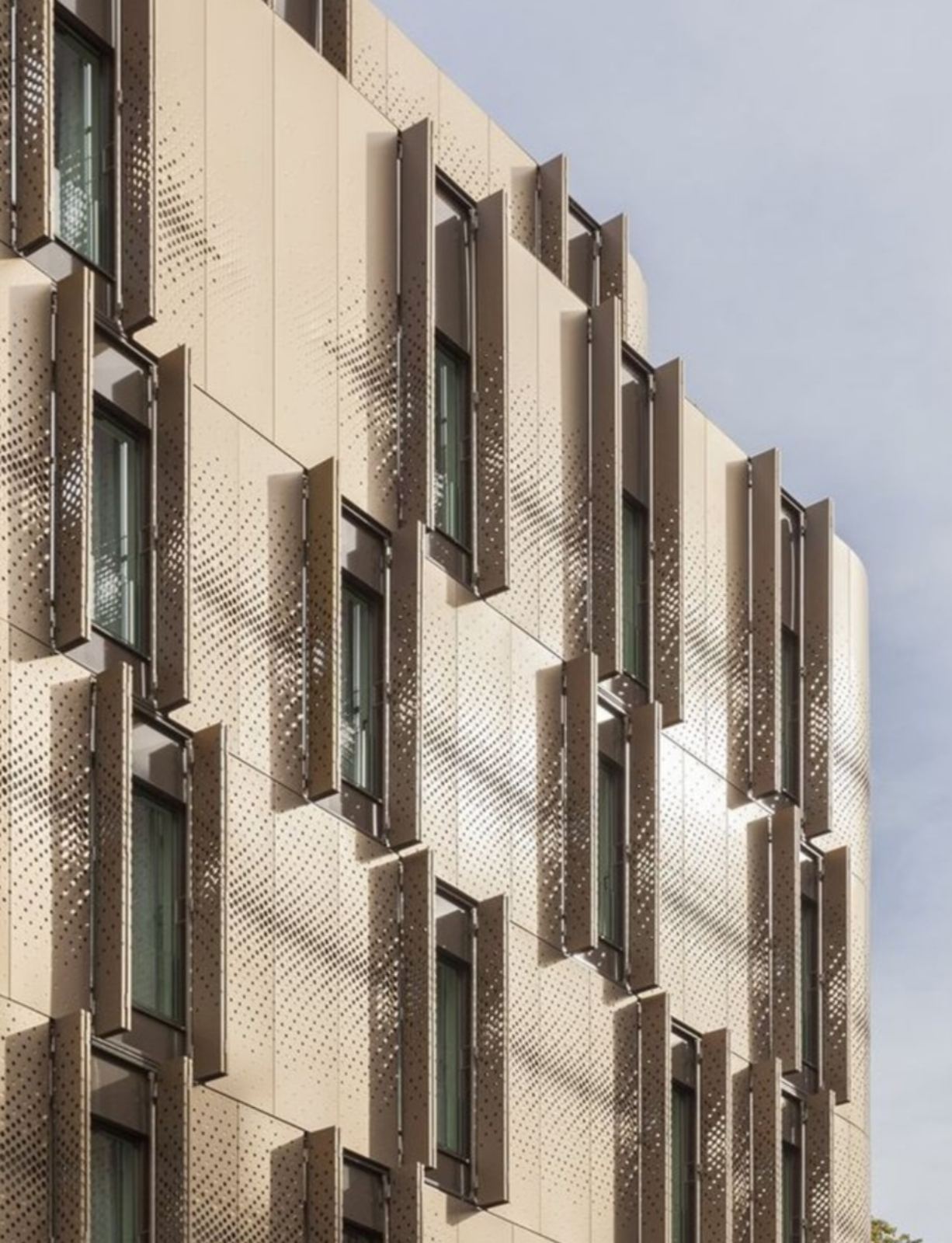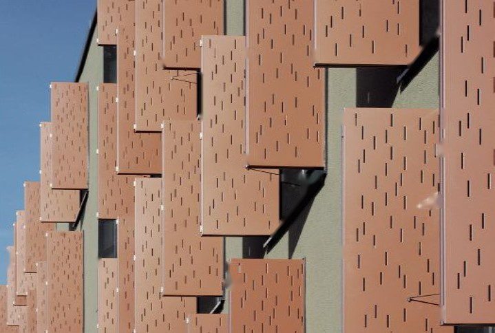 AVGFLEX FOLDING MANUAL harmonikové skladacie fasádne panely a skladacie okenice tvoria dynamický „živý plášť“ budovy. Cez deň zabezpečujú tienenie, večer fasádu odľahčujú perforovaným svetelným rastrom. Kombináciou plných a perforovaných výplní, reliéfnych (embosovaných) vzorov a farieb vytvárame na mieru identitu objektu a to od minimalistickej až po výrazne dekorovanú. V režime otvorenia sa panely kompaktne „odsunú“ mimo výhľad a po „zatvorení“ nadviažu na rytmus fasády.