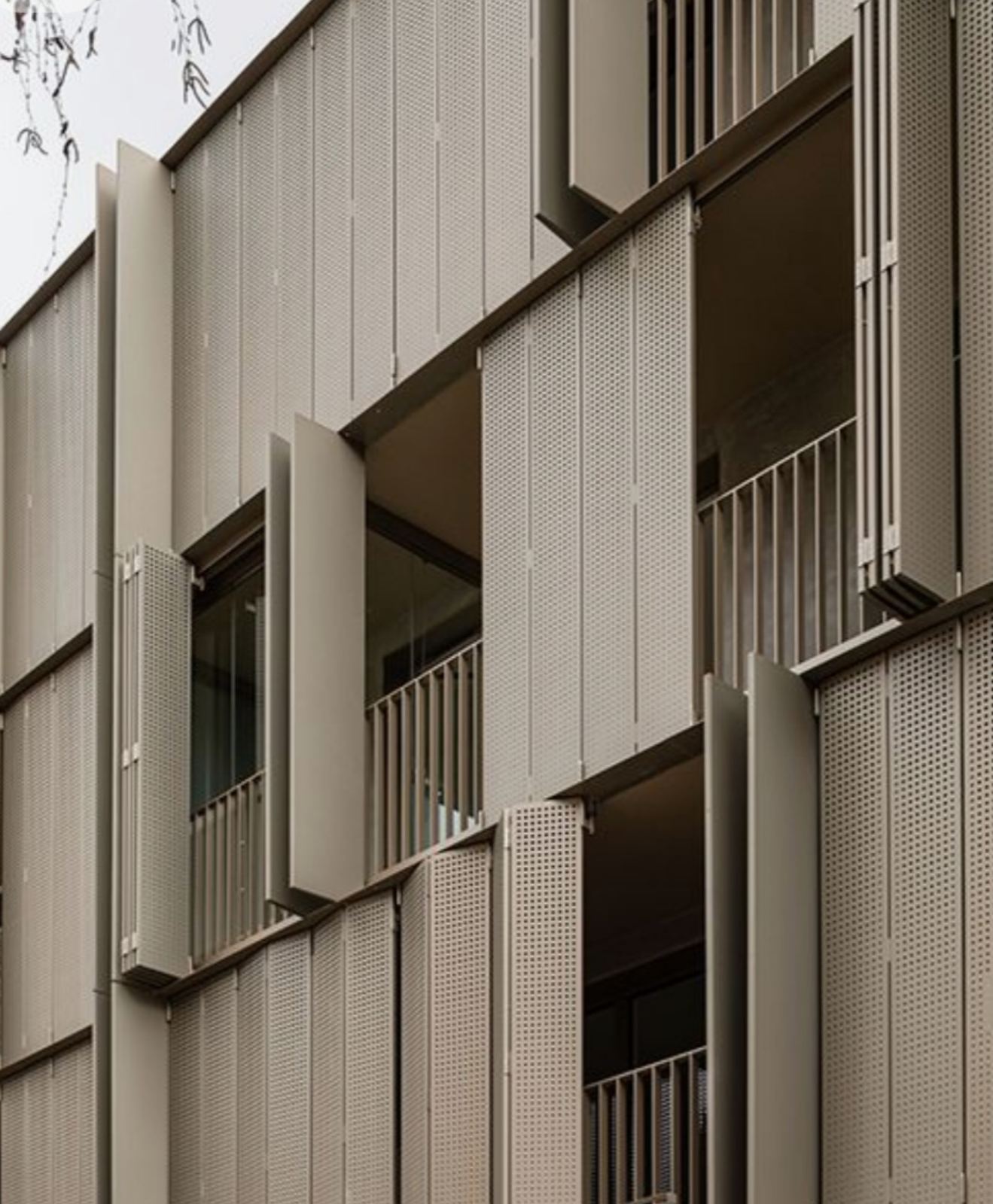 Skladacie okenice, harmonikové fasádne panely, skladacie fasádne krídla AVGFLEX FOLDING MANUAL, môžu byť vyrobené v rovnakom materiálovom, farebnom a perforovanom vyhotovení ako fasádne kazety, lamely či dizajnové profily AVG METAL. Výsledkom je fasáda, ktorá pôsobí kompaktným a esteticky koherentným dojmom, pričom pohyblivé časti sú vizuálne nerozoznateľné od pevných panelov až kým sa neotvoria.